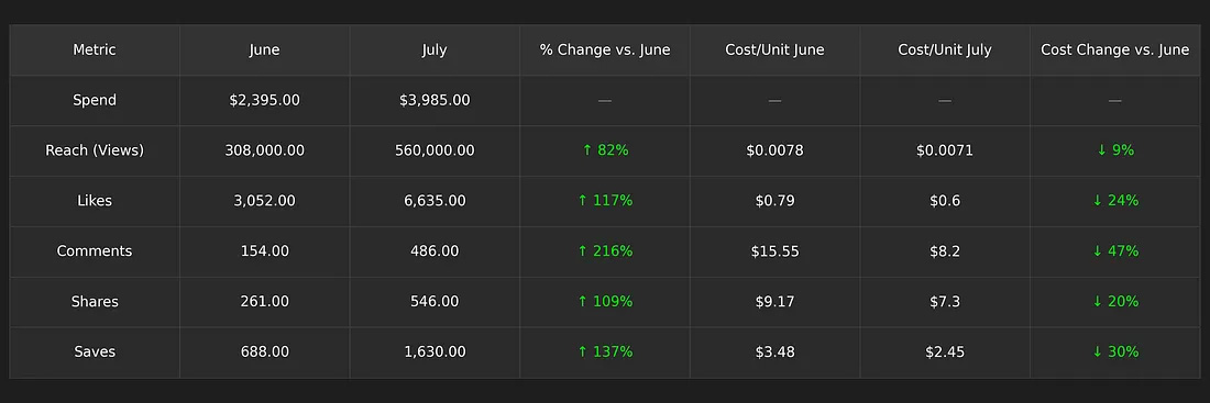 In July, Hydra Chain built on June’s Instagram KOL momentum by scaling proven tactics and optimizing for higher reach and efficiency. The result was another record-breaking month for total engagements and continued cost-per-action improvements.